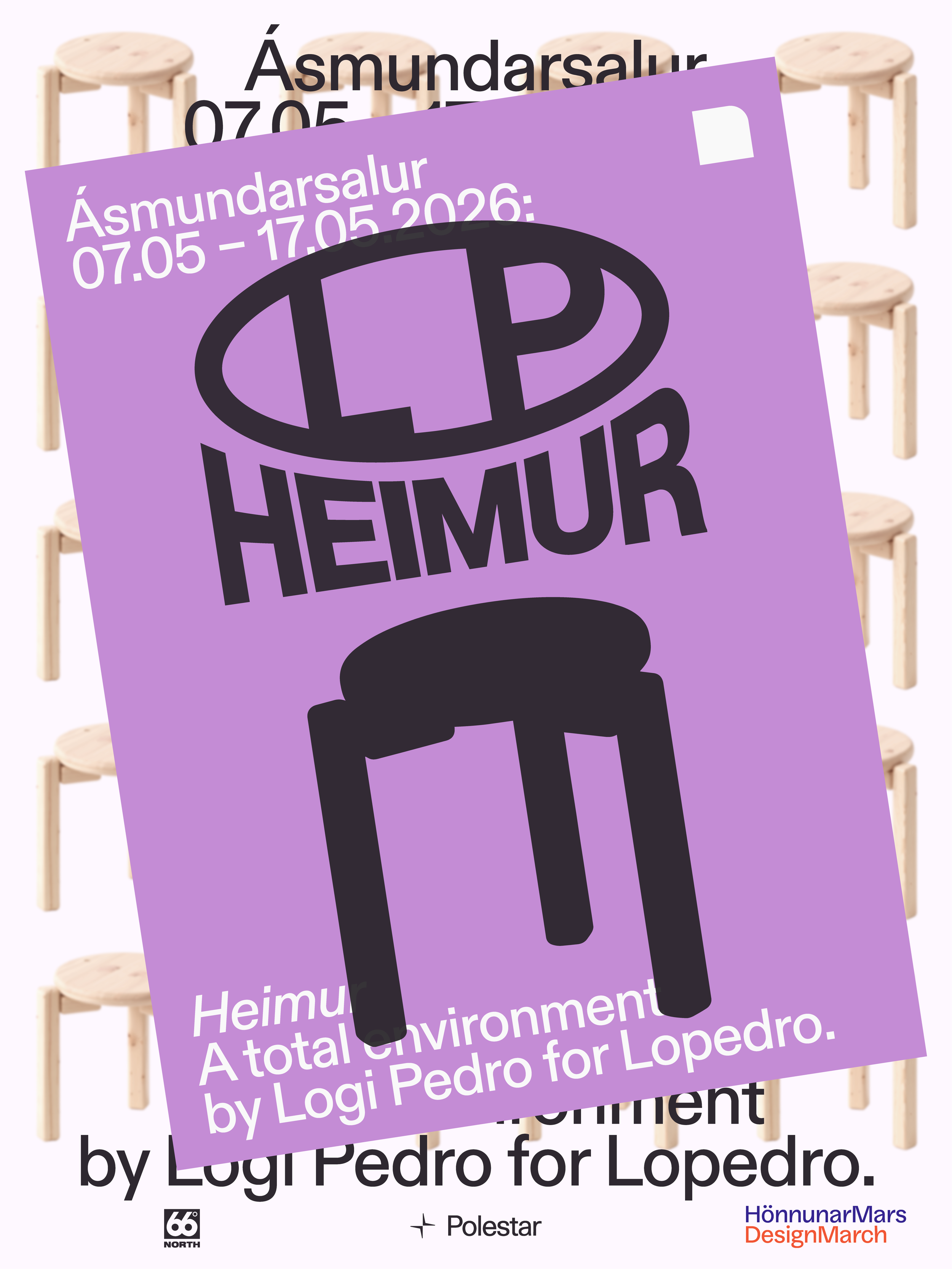 Heimur is a solo exhibition by Icelandic-Angolan designer Logi Pedro, opening 7 May at Ásmundarsalur during HönnunarMars 2026. A complete domestic environment of more than twenty objects designed and fabricated from scratch, Heimur proposes a home built from a third position, neither inherited from Scandinavian design nor borrowed from elsewhere, but authored from a single vocabulary.
