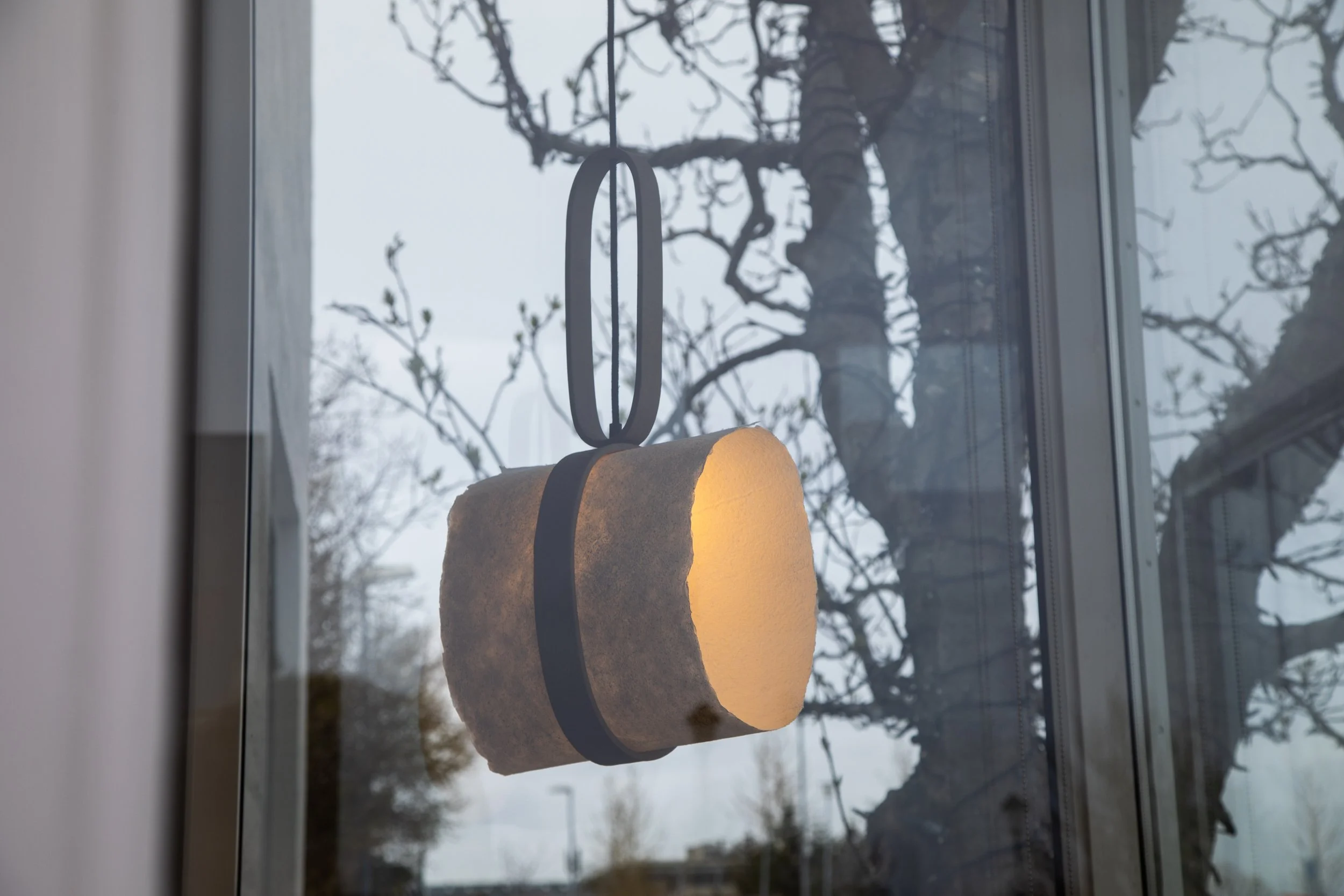 Icelandic minerals and herbs serve as both the inspiration and material used for the lamps in the ex- hibtion. Studio Miklo works with the interaction between different media that shed innovative vision on the use of clay and textils. The eco-friendly lamp shades are made from cotton fibers extracted from unusable textiles in order to promote the circular economy and minimize waste.
